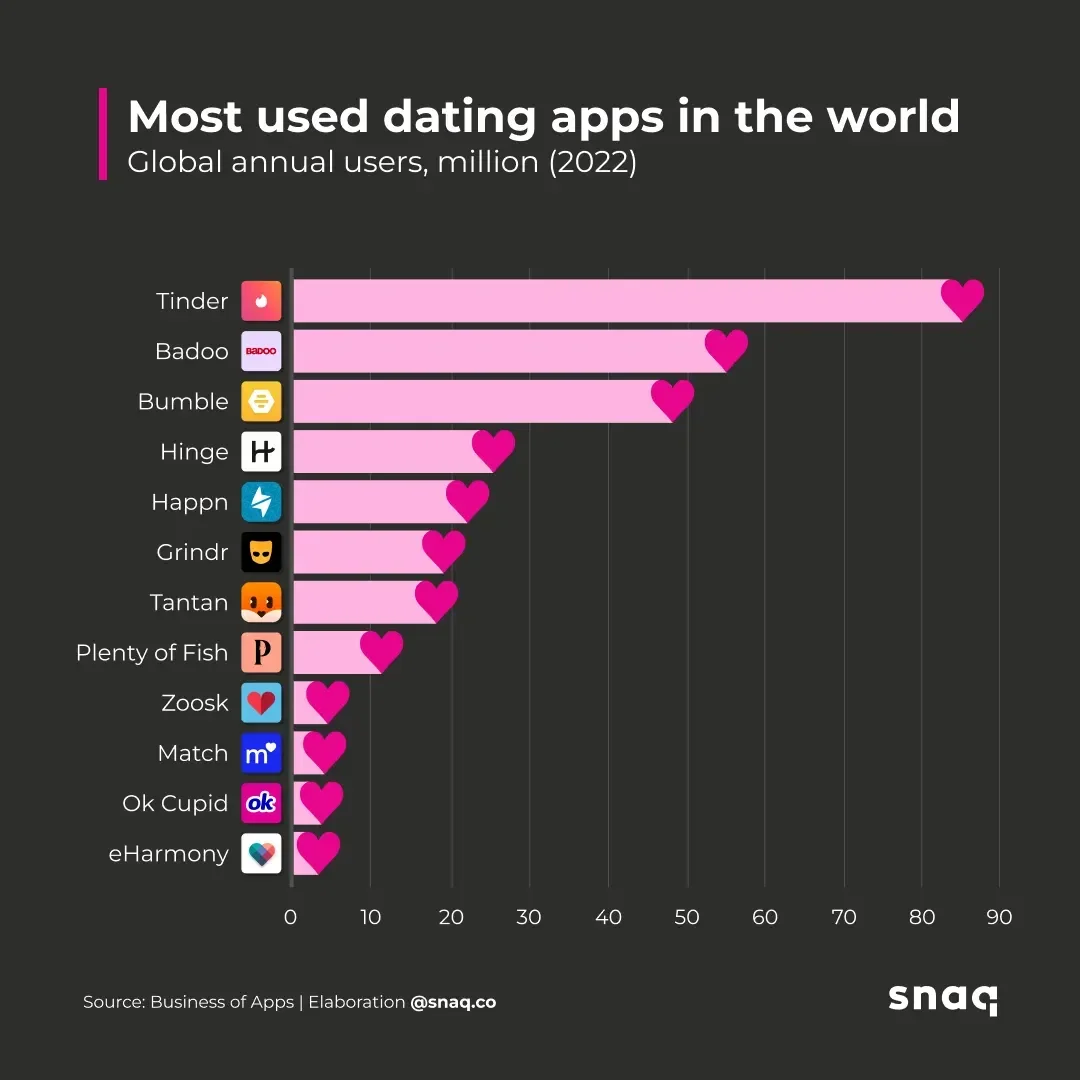 Figure 2: Tinder is the leading global dating app, closely followed by Badoo and Bumble [9].